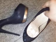 Massive cumshot on sexy high heel shoes and pantyhosed feet